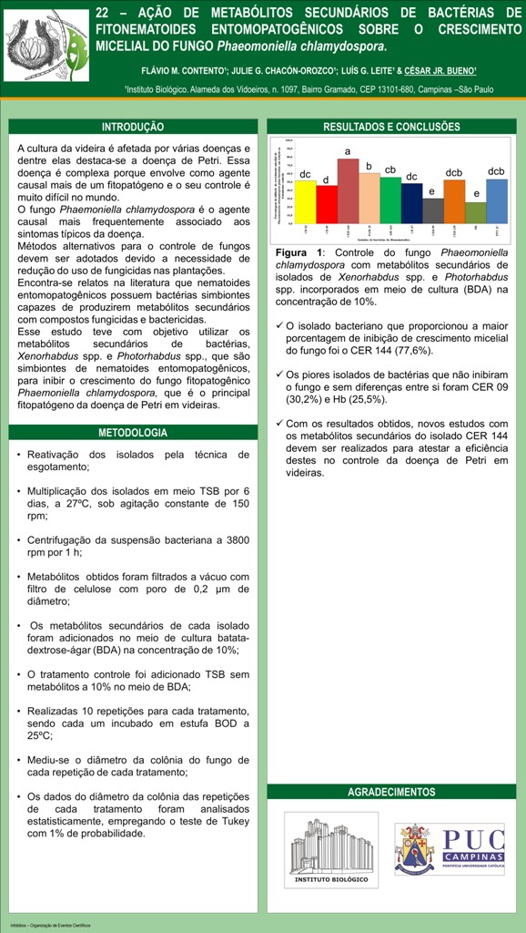 INIBIÇÃO MICELIAL DO FUNGO Phaeomoniella chlamydospora POR METABÓLITOS SECUNDÁRIOS DE BACTÉRIAS Xenorhabdus spp. e Photorhabdus spp.