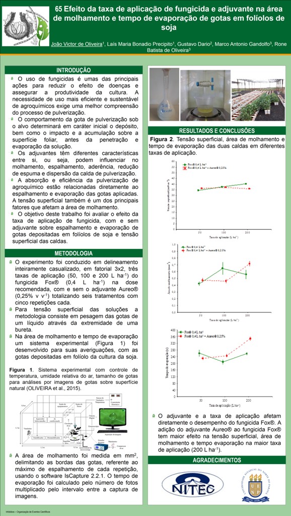 EFEITO DA TAXA DE APLICAÇÃO DE FUNGICIDA E ADJUVANTE NA ÁREA DE MOLHAMENTO E TEMPO DE EVAPORAÇÃO DE GOTAS EM FOLÍOLOS DE SOJA