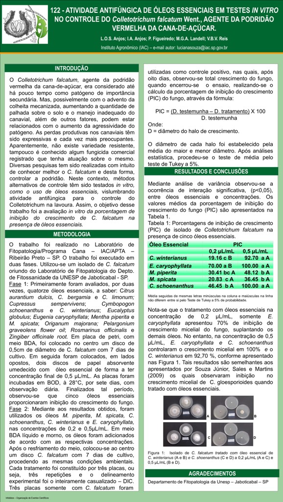 ATIVIDADE ANTIFÚNGICA DE ÓLEOS ESSENCIAIS EM TESTES IN VITRO NO CONTROLE DO Colletotrichum falcatum, AGENTE DA PODRIDÃO VERMELHA DA CANA-DE-AÇÚCAR