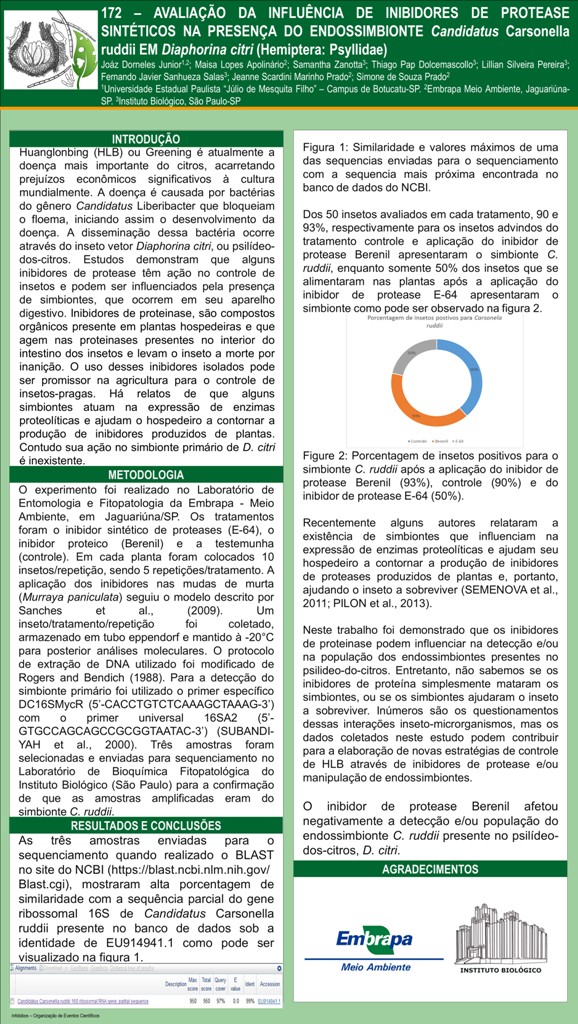 AVALIAÇÃO DA INFLUÊNCIA DE INIBIDORES DE PROTEASE SINTÉTICOS NA PRESENÇA DO ENDOSSIMBIONTE Candidatus Carsonella ruddii EM Diaphorina citri (HEMIPTERA: PSYLLIDAE)