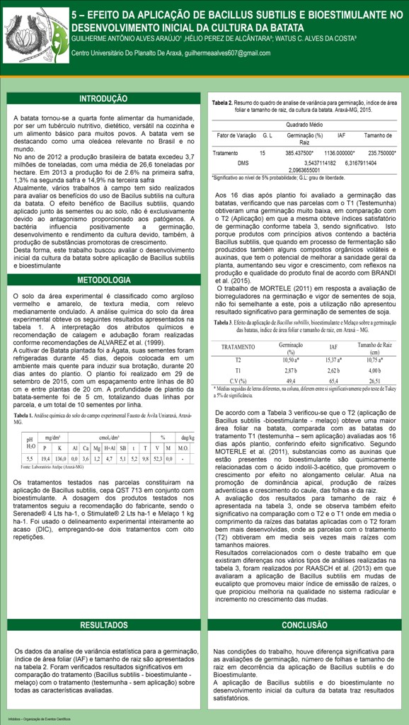 EFEITO DA APLICAÇÃO DE Bacillus substilis E BIOESTIMULANTE NO DESENVOLVIMENTO INICIAL DA CULTURA DA BATATA