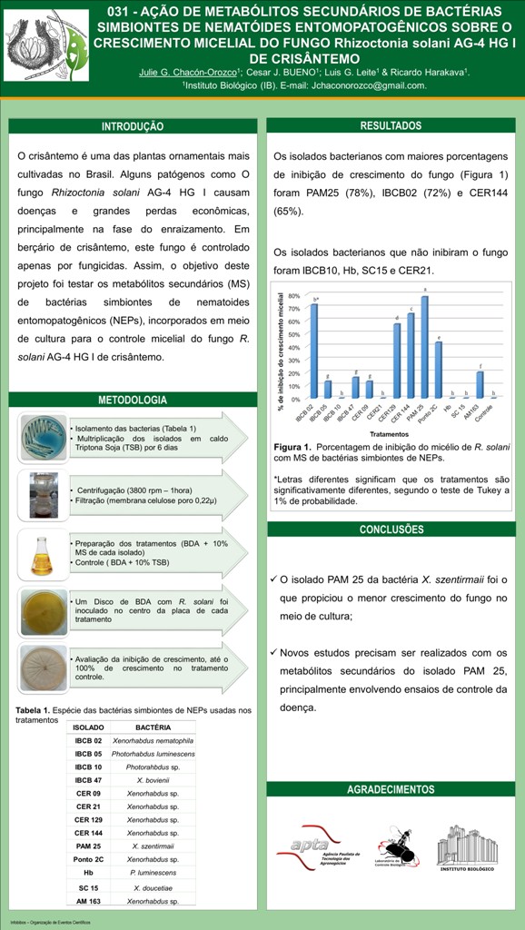 AÇÃO DE METABÓLITOS SECUNDÁRIOS DE BACTÉRIAS SIMBIONTES DE NEMATÓIDES ENTOMOPATOGÊNICOS SOBRE O CRESCIMENTO MICELIAL DO FUNGO Rhizoctonia solani AG-4 HG I DE CRISÂNTEMO