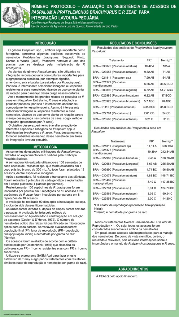 AVALIAÇÃO DA RESISTÊNCIA DE ACESSOS DE Paspalum a Pratylenchus brachyurus E P. Zeae PARA INTEGRAÇÃO LAVOURA-PECUÁRIA