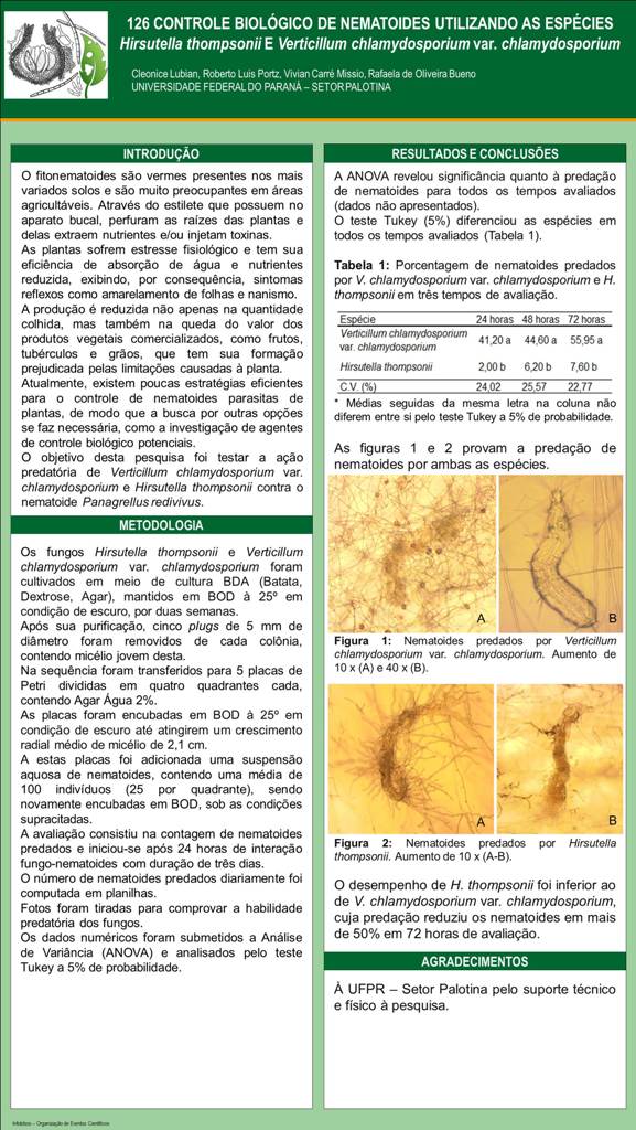 CONTROLE BIOLÓGICO DE NEMATOIDES UTILIZANDO AS ESPÉCIES Hirsutella thompsonii E Verticillum chlamydosporium var. chlamydosporium