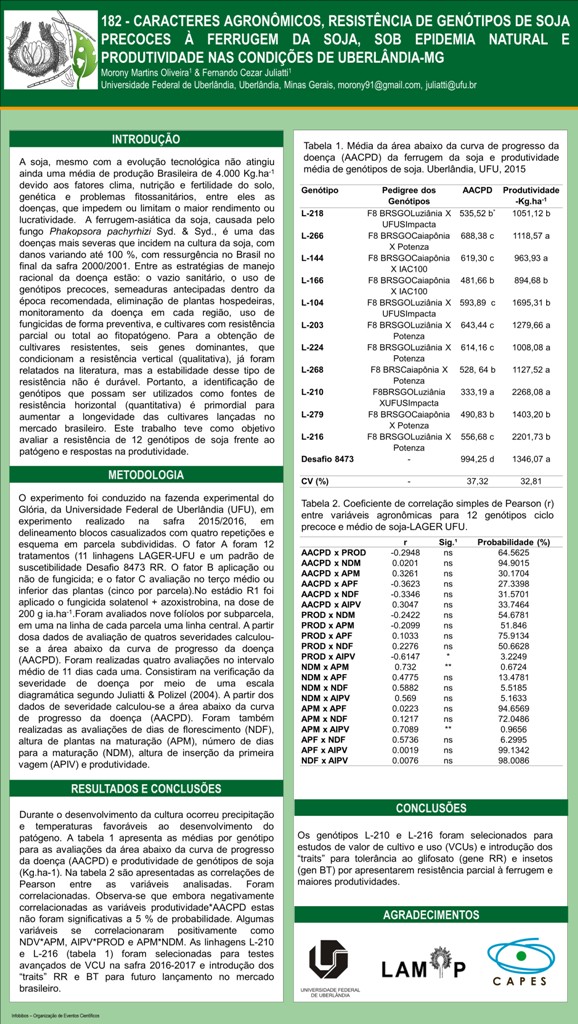 CARACTERES AGRONÔMICOS, RESISTÊNCIA DE GENÓTIPOS DE SOJA PRECOCES À FERRUGEM DA SOJA, SOB EPIDEMIA NATURAL E PRODUTIVIDADE NAS CONDIÇÕES DE UBERLÂNDIA-MG